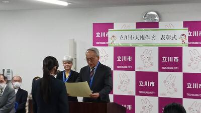 昨日の夕方、立川市役所で人権作文表彰式が行われました。応募作文984編の中から12編が選ばれての表彰式でした。本校からは2年生の三宅さんが優秀賞を受賞しました。「生きる権利」と題して作文を書きました。おめでとうございます。