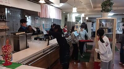 食事係がてきぱきと準備しています。