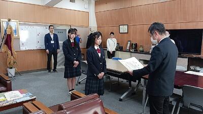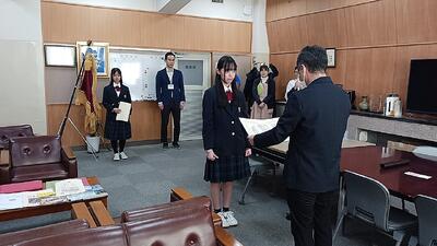 昨日、校長室で中学校技術・家庭科副読本「考えよう!わたしたちの快適な住まい」の第30回読後感想文コンクールの表彰式が行われました。応募作品5790編の中から金賞(10編)と佳作(50編)に本校の生徒2名が受賞しました。おめでとうございます。快適な住まいとはどのような条件のもとで得ることができるかを考えてもらう主旨の作文でした。来校された日本総合住生活株式会社の方は、地域の人たちとのつながりを大切にした素晴らしい内容の作文と褒めていました。生徒の皆さんは、これからも地域との関わりを大切にしながら、地域に貢献する生徒を目指していってほしいと思います。