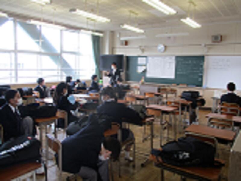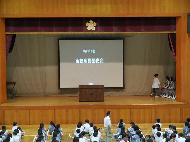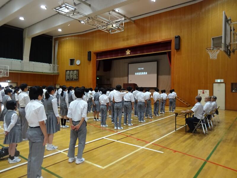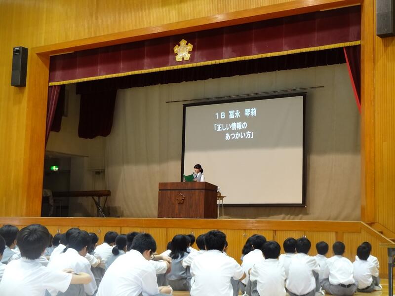 | 夏季休業中の宿題として 全生徒が、さまざまな事柄について意見をまとめ、発表します。 班内発表から始まり、最後は全校での意見発表会が行われます。地域の方々も参加されます。 | ||