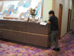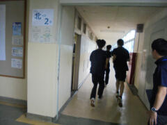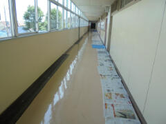 北校舎3階ではとても暑い廊下で、用務主事さんが廊下の研磨とワックスがけをしてくれていました。写真では分かりにくいでしょうが、半分がピッカピカになっています。きっと2学期はきれいに磨いてくれた廊下に会えることでしょう。お楽しみに。