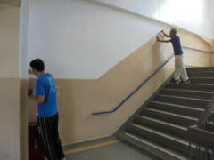9月3日(水)3校時に廊下を歩いていたら、今日も2人の用務主事さんが北校舎東階段の壁の塗装をやっていました。夏休み中のブログにも書きましたが、(古い校舎なのに)いつもコツコツと廊下を磨いてくれたり黒板を塗り直してくれています。少しずつ三中をキレイにしてくれているのです。三中生のみなさん、次はみなさんの番です。みなさんの役割は、校舎をキレイに使うよう心がけること。汚さないように声を掛け合うこと。よろしくお願いしますね!ぜひ学校生活の中でキレイにしてくれている用務主事さんたちを見かけたら、感謝の気持ちを伝えてください。