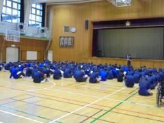 2校時は1年生が仮設トイレや仮設便器の組み立てを実際にやってみました。2年生は地域の方から防災講話を聞き考えました。3年生は2校時・3校時を通して防災教室ということで、首都圏防災士連絡会よりお越しいただき、身近なものを使った応急処置や傷病者の搬送方法、気象予報士による講話をいただきました。