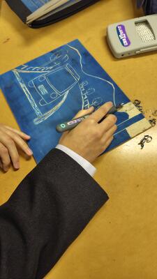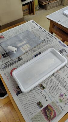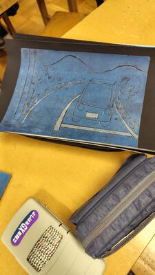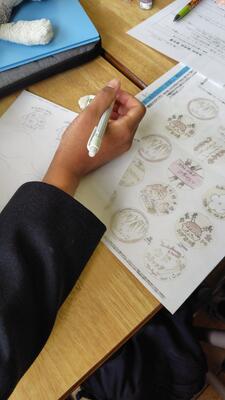 この班では、版画の多面釣りにチャレンジしています。1学期に撮影した風景をもとに、原画を作成し木板に彫りを入れていきます。江戸時代は、絵師、彫師、摺師と分業がなされていた作業を一人で行うのでとても大変な作業に挑戦しています。