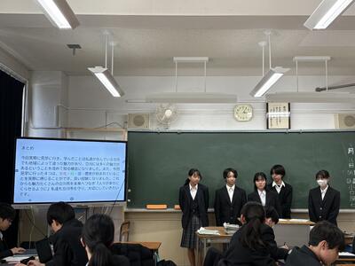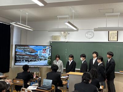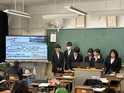 立川市民科の学習の一環として実施した「立川駅前見学」の事後学習として、各班による研究発表会を行いました。