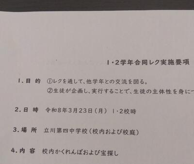 明日(月曜日)は、1・2年生の合同レクが予定されています。生徒が企画した取組で、内容は、かくれんぼ&宝探しとのことです。楽しみです。