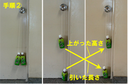 ③ 片方のおもりを下に引きます。このとき、「ひもを引いた長さ」と「もう一方のおもりが持ち上がった高さ」を記録します。