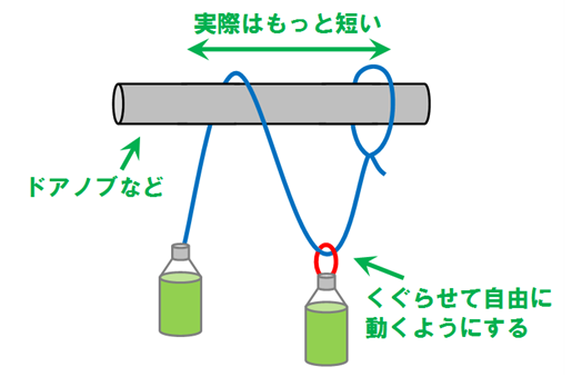 →同じ重さのおもりが必要です。ペットボトルが最適。同じ容量で未開封なら、銘柄が違ってもOKです。もちろん、ペットボトルにこだわる必要はありませんが、ある程度の質量があった方が結果を体感しやすくなります。