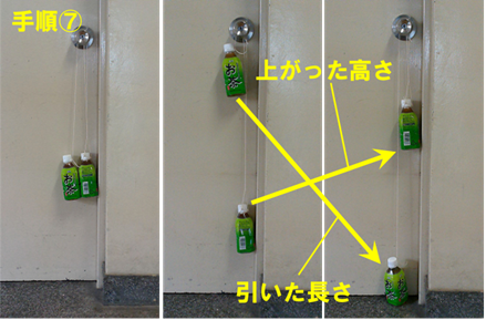 ⑧ ③から⑤と同じように、おもりを引き、長さ、高さ、力加減を記録します。