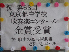 8月9日(水)府中の森芸術劇場で行われた、東京中学校吹奏楽コンクールにおいて金賞を受賞することができました。今年は曲の難易度が高く、また、どりーむホールという一番大きなホールで演奏することが決まっていたため、曲の完成度をあげることや、いかに音を遠くまで響かせるかということに苦戦したこともありました。何度も細かい練習を重ねて、創り上げた六中サウンドがホールに響いた瞬間やゴールド金賞という言葉を聞いた瞬間は、生徒たちにとっても大きな達成感に包まれたことでしょう。コンクールを迎えるにあたり、地域の皆様や保護者の皆様には様々な場面で支えていただきました。本当にありがとうございました。これからもさらなる高みを目指して、部員一同精進していきたいと思います。