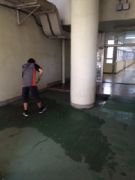が体育館出入口付近の枝葉を片付けていました。生徒がすべって