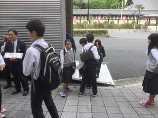 今朝、出勤後溜まっていた書類を片付けいると、挨拶運動が始まりました。2年評議委員が自主的に学校をさらによくする活動として回数を増やして取り組んでいる活動です。