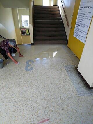 構内を見回ると何箇所か雨の吹き込みがあり管理員さんが先に拭き取ってくださっていたので、一緒に副校長さんとで水を拭き取って回りました。