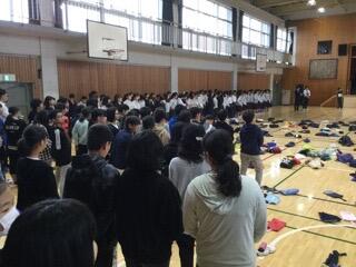昨日の合唱コンクールでは、RISURUホールに集まり、ましたが、吹奏楽や太鼓部の生徒は楽器の積み込みのために7時過ぎには学校に集まって機材の積み込みをしていました。8時半をすぎるとポツポツとホールの前に生徒が集まり始め、8時15分にはほぼ全員が遅刻もほとんどなく集合できました。
