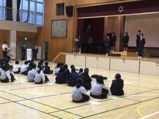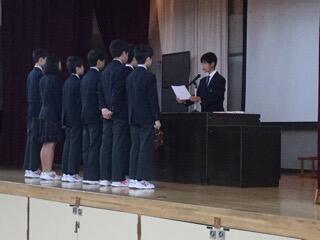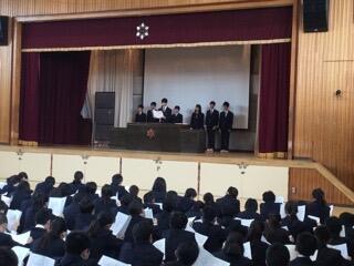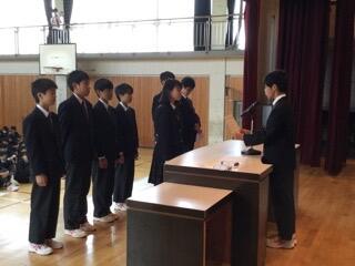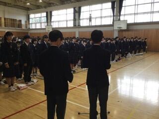 今日の生徒会朝礼は、生徒総会を兼ねて実施されました。最初に委嘱式で各委員会の委員長が生徒会長から委嘱を受け、その後委員長から後期の活動報告が発表され承認を受けました。