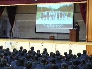 先日立川教育フォーラムで発表した本校生徒が、今日は朝礼で全校生徒に報告しました。