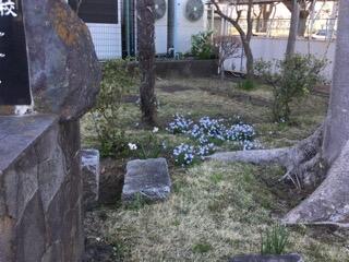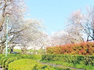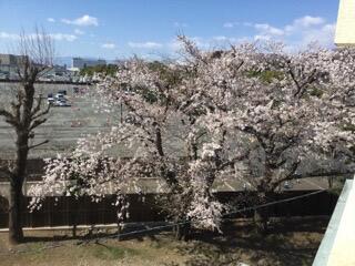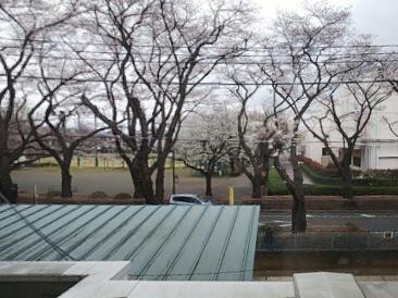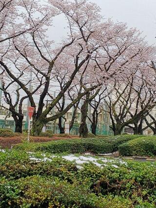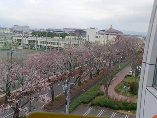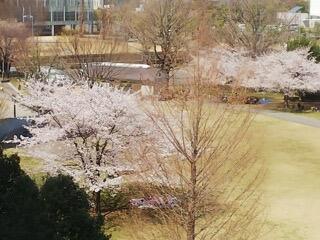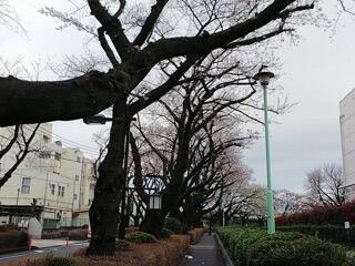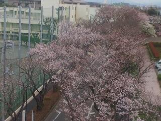 校門前の公園方向。中段の枝も残り美しく咲いています。