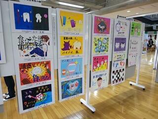 市役所のホールに本校と他校の児童生徒の歯のポスターが展示されています。