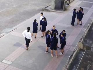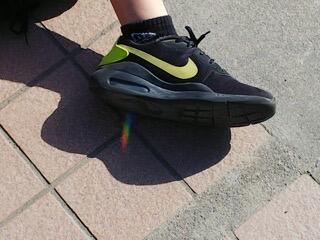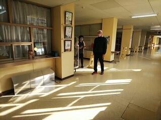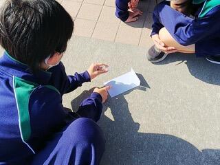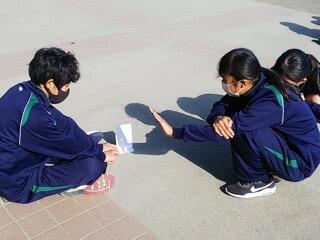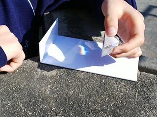 昇降口で声がするので行ってみると理科の観察でプリズムで太陽光を観察していました。