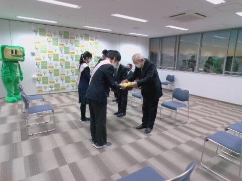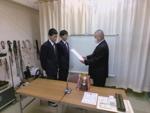 野球部の市民大会一位とバトミントン部一年生大会一位の表彰を行いました。