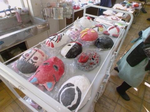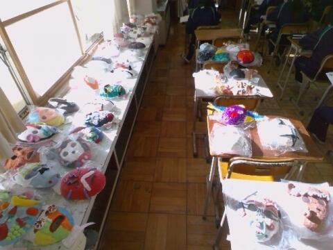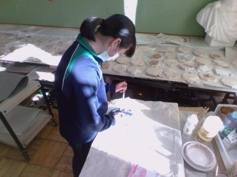 美術はお面の仕上げに入り、ニス塗りをしていました。
