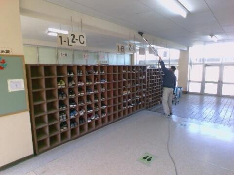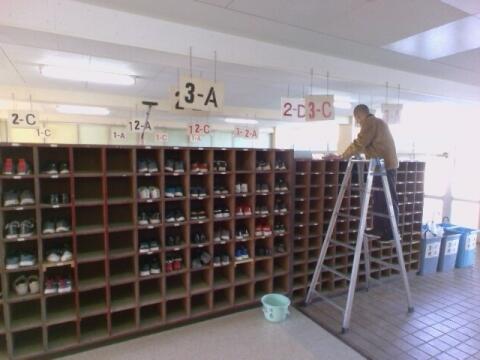 玄関部の生徒に任せられない部分を大掃除する用務主事さん