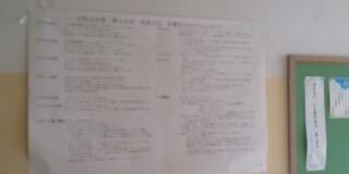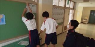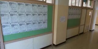 放課後にクラスの掲示物を貼り付けるボランティアの精鋭たち。