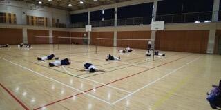 同じく部活動の準備運動をするバトミントン部員 ファイト オー の掛け声