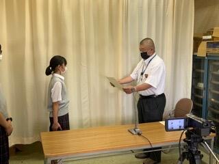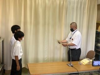 夏休み中に、成果を出したソフトテニスや吹奏楽部、サッカー部の表彰を行いました。
