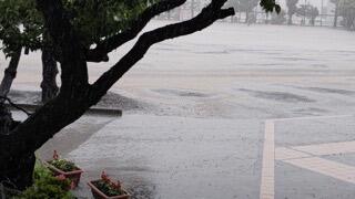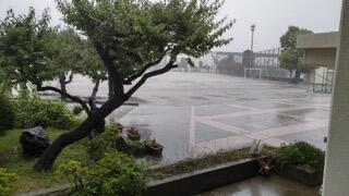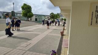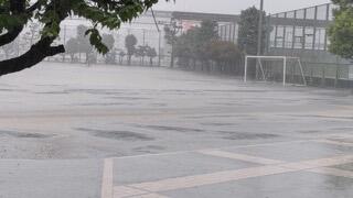 1時間目の頃から降り始めた雨が午前中土砂降りになり、体育館の渡り廊下も歩くとずぶ濡れになるほどでした。