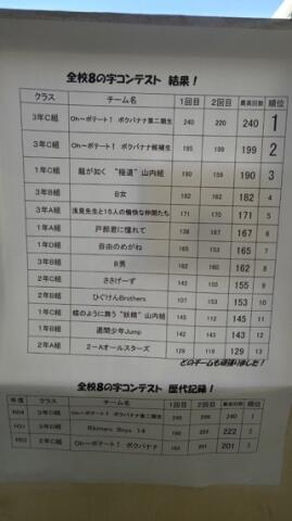試験後、先日の8の字縄跳びコンテストの結果を見ている生徒がいたので話を聞くと、