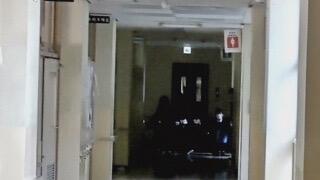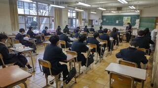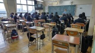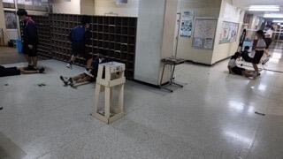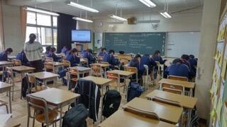 しゃがんで安全姿勢で待機する生徒