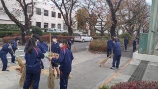 約100名の生徒ボランティアが参加して校門周辺から落ち葉やゴミを清掃しました。