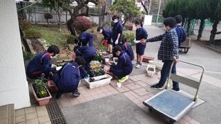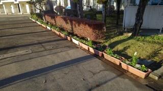 先日の桜並木清掃でプランターに植えた草花が落ち着いた様で、正門前に整列しました。