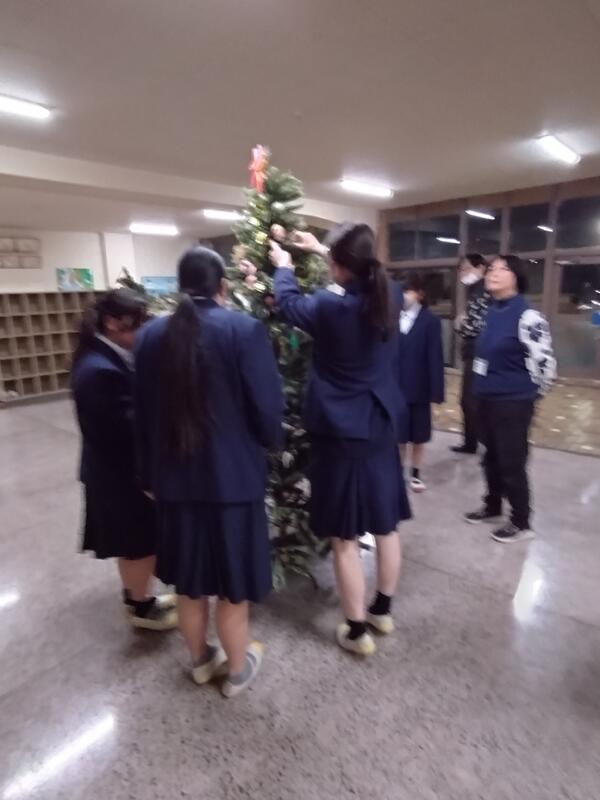 クリスマスイベント(生徒会) 投稿日時 : 12/22 校長 ■12月22日(月)、先週から2階玄関にはクリスマスツリーが設置されています。生徒会本部と美術部の皆さんが準備をしてくれました。 ■欲しいものや願いごとなどを書いて、ツリーに飾ります。日を追うごとに飾りが増えていきます。