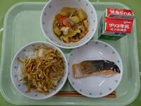 30日(金)は、揚げごぼうごはん、鮭の塩焼き、生揚げと野菜の煮物、牛乳という献立でした。