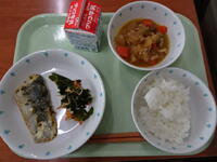 この日のメニューは、さわらのガーリックソテー、わかめともやしの和え物、鶏肉と大根の煮物、ごはん、牛乳でした。