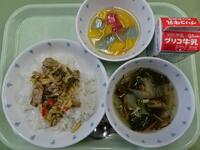 29日(水)のメニューはチンジャオロース丼、もずくのスープ、サイダーポンチ、牛乳でした。